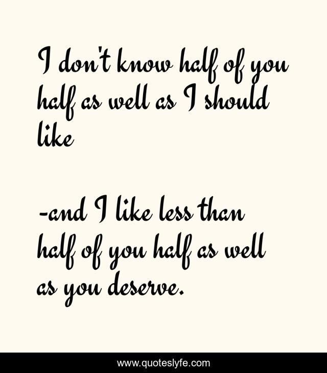 "and I like less than half of you half as well as you deserve. Quotes." Quoteslyfe.com, 2025. Sun. 07 Dec. 2025. <https://www.quoteslyfe.com/quote/I-don-t-know-half-of-you-85660>.