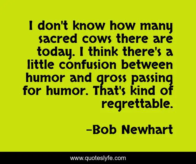 This page presents the quote "I don't know how many sacred cows there are today. I think there's a little confusion between humor and gross passing for humor. That's kind of regrettable.". Author of this quote is Bob Newhart. This quote is about think, today,.