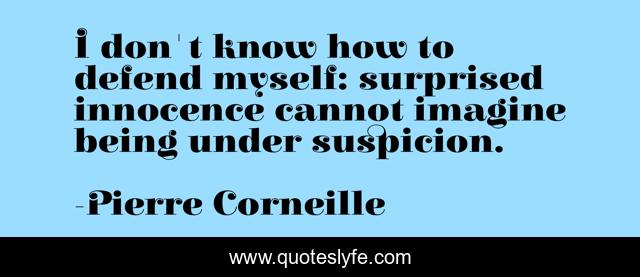 This page presents the quote "I don't know how to defend myself: surprised innocence cannot imagine being under suspicion.". Author of this quote is Pierre Corneille. This quote is about suspicion, innocence,.