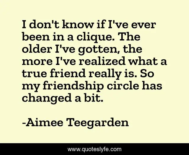 This page presents the quote "I don't know if I've ever been in a clique. The older I've gotten, the more I've realized what a true friend really is. So my friendship circle has changed a bit.". Author of this quote is Aimee Teegarden. This quote is about true friend, friend,.