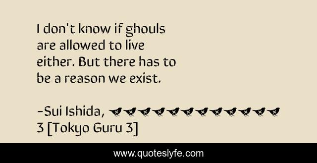 This page presents the quote "I don't know if ghouls are allowed to live either. But there has to be a reason we exist.". Author of this quote is Sui Ishida, 東京喰種トーキョーグール 3 [Tokyo Guru 3]. This quote is about horror, kaneki, manga,.