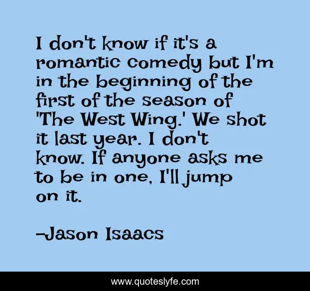 This page presents the quote "I don't know if it's a romantic comedy but I'm in the beginning of the first of the season of 'The West Wing.' We shot it last year. I don't know. If anyone asks me to be in one, I'll jump on it.". Author of this quote is Jason Isaacs. This quote is about me, beginning,.