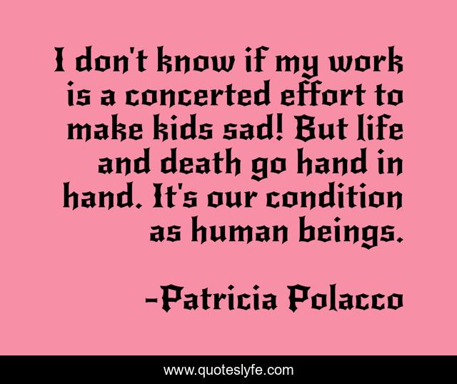 This page presents the quote "I don't know if my work is a concerted effort to make kids sad! But life and death go hand in hand. It's our condition as human beings.". Author of this quote is Patricia Polacco. This quote is about work, life, death,.