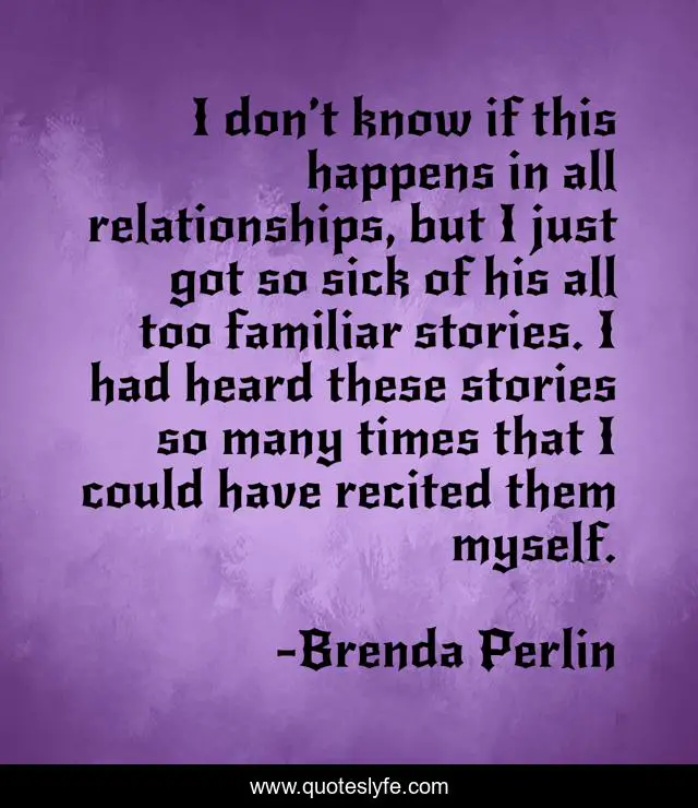 This page presents the quote "I don’t know if this happens in all relationships, but I just got so sick of his all too familiar stories. I had heard these stories so many times that I could have recited them myself.". Author of this quote is Brenda Perlin. This quote is about loss, love, divorce, coming-of-age, marriage, affection,.