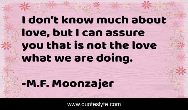 This page presents the quote "I don’t know much about love, but I can assure you that is not the love what we are doing.". Author of this quote is M.F. Moonzajer. This quote is about love, affection, loving,.