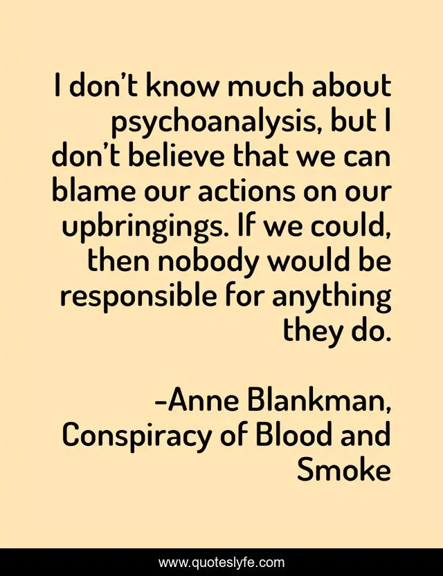 This page presents the quote "I don’t know much about psychoanalysis, but I don’t believe that we can blame our actions on our upbringings. If we could, then nobody would be responsible for anything they do.". Author of this quote is Anne Blankman, Conspiracy of Blood and Smoke. This quote is about wwii, ya, hitler, thriller,.