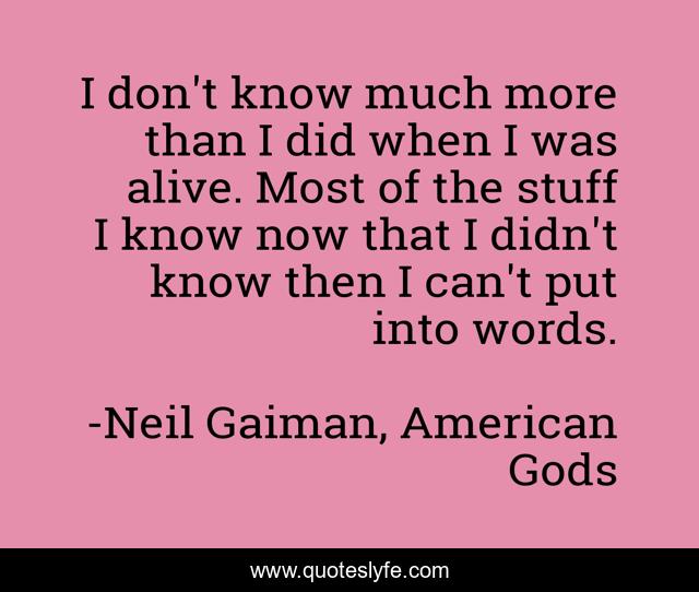 This page presents the quote "I don't know much more than I did when I was alive. Most of the stuff I know now that I didn't know then I can't put into words.". Author of this quote is Neil Gaiman, American Gods. This quote is about death, knowledge,.