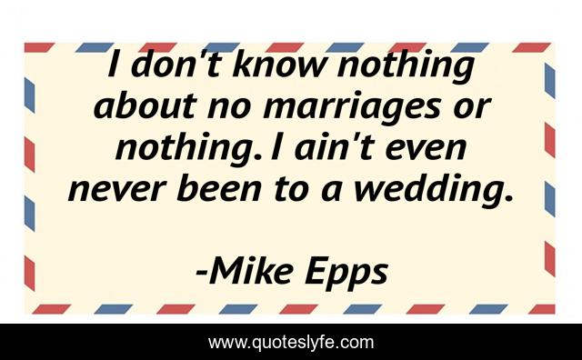 This page presents the quote "I don't know nothing about no marriages or nothing. I ain't even never been to a wedding.". Author of this quote is Mike Epps. .