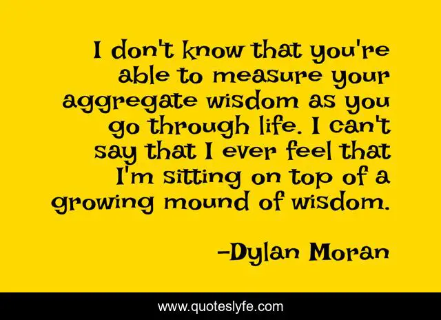 This page presents the quote "I don't know that you're able to measure your aggregate wisdom as you go through life. I can't say that I ever feel that I'm sitting on top of a growing mound of wisdom.". Author of this quote is Dylan Moran. This quote is about life, measure,.