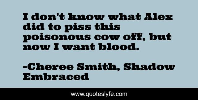 This page presents the quote "I don't know what Alex did to piss this poisonous cow off, but now I want blood.". Author of this quote is Cheree Smith, Shadow Embraced. This quote is about vampires, kick-butt, contemporary,.