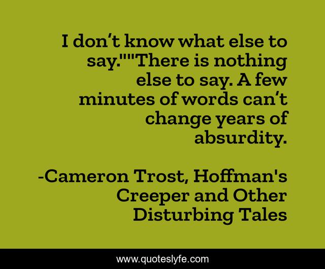 This page presents the quote "I don’t know what else to say.""There is nothing else to say. A few minutes of words can’t change years of absurdity.". Author of this quote is Cameron Trost, Hoffman's Creeper and Other Disturbing Tales. This quote is about suspense, short-story,.