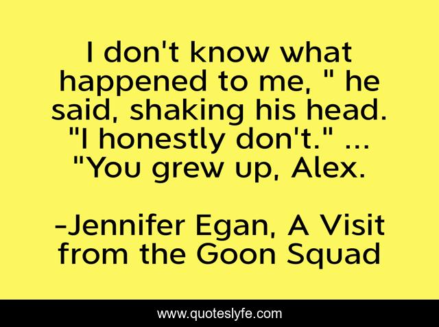 This page presents the quote "I don't know what happened to me, " he said, shaking his head. "I honestly don't." ... "You grew up, Alex.". Author of this quote is Jennifer Egan, A Visit from the Goon Squad. This quote is about grew-up, time,.