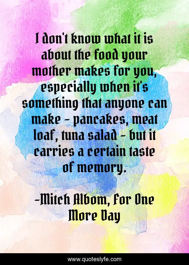 This page presents the quote "I don't know what it is about the food your mother makes for you, especially when it's something that anyone can make - pancakes, meat loaf, tuna salad - but it carries a certain taste of memory.". Author of this quote is Mitch Albom, For One More Day. This quote is about food, memory, love, affection, mother,.