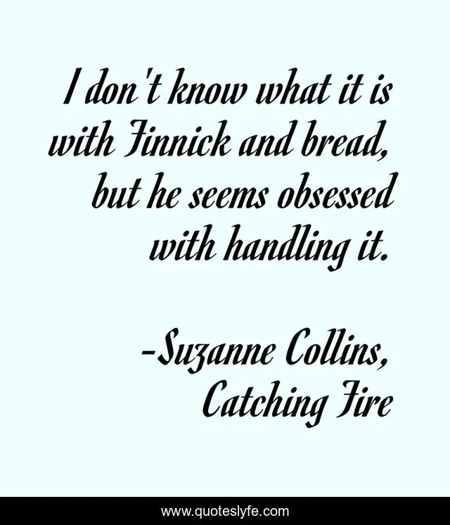 This page presents the quote "I don't know what it is with Finnick and bread, but he seems obsessed with handling it.". Author of this quote is Suzanne Collins, Catching Fire. This quote is about fire, catching, games, finnick, hunger,.
