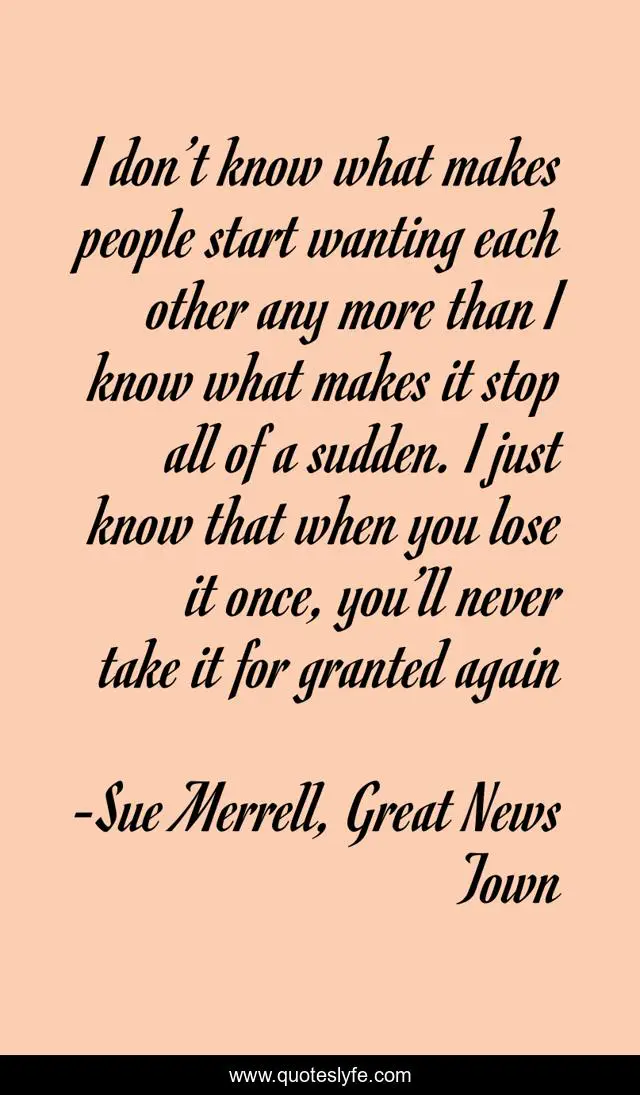 This page presents the quote "I don’t know what makes people start wanting each other any more than I know what makes it stop all of a sudden. I just know that when you lose it once, you’ll never take it for granted again". Author of this quote is Sue Merrell, Great News Town. This quote is about desire, loss, love, divorce, love-hurts, affection,.