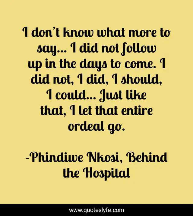 This page presents the quote "I don’t know what more to say... I did not follow up in the days to come. I did not, I did, I should, I could... Just like that, I let that entire ordeal go.". Author of this quote is Phindiwe Nkosi, Behind the Hospital. This quote is about knowing, love, knowledge, confusion, scared, ordeal, let-go, pain, fear,.