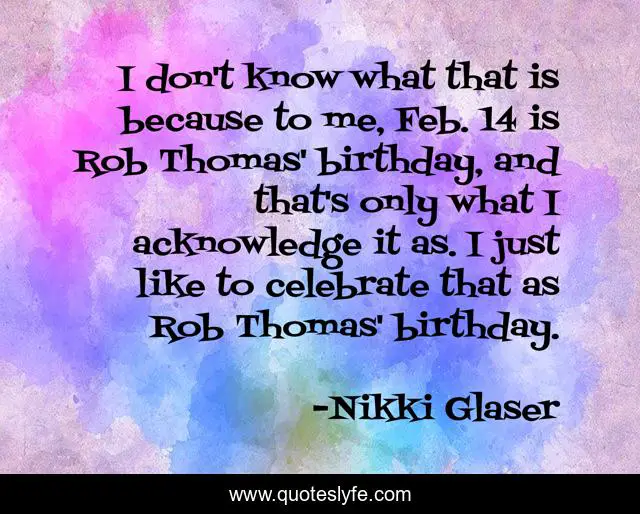 This page presents the quote "I don't know what that is because to me, Feb. 14 is Rob Thomas' birthday, and that's only what I acknowledge it as. I just like to celebrate that as Rob Thomas' birthday.". Author of this quote is Nikki Glaser. This quote is about me, celebrate,.