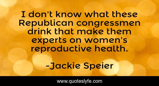 This page presents the quote "I don't know what these Republican congressmen drink that make them experts on women's reproductive health.". Author of this quote is Jackie Speier. This quote is about drink, women,.