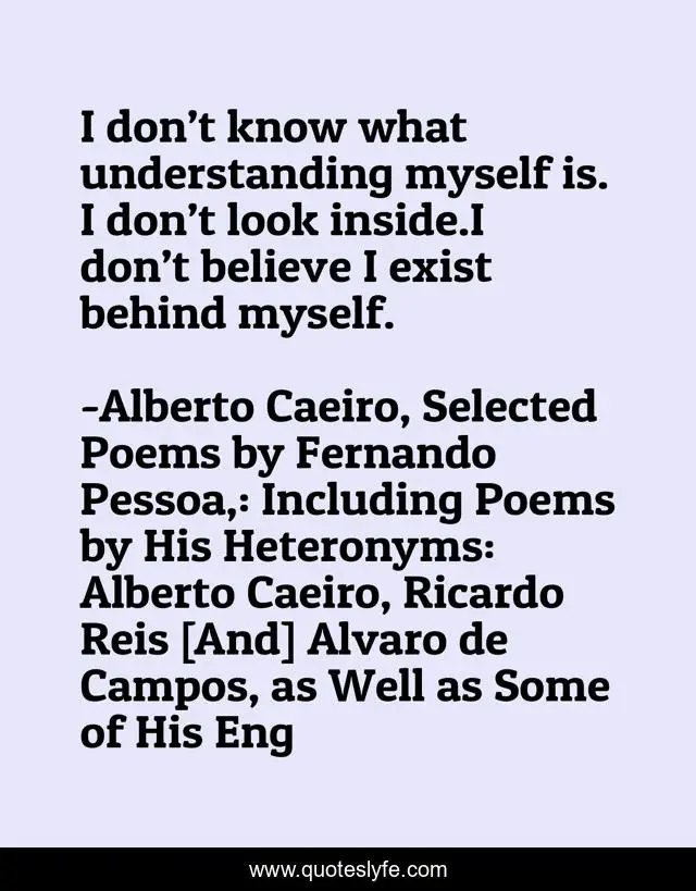 This page presents the quote "I don’t know what understanding myself is. I don’t look inside.I don’t believe I exist behind myself.". Author of this quote is Alberto Caeiro, Selected Poems by Fernando Pessoa,: Including Poems by His Heteronyms: Alberto Caeiro, Ricardo Reis [And] Alvaro de Campos, as Well as Some of His Eng. This quote is about personae, pantheism, feeling, reality, nature, being, self, understanding, meaning-of-life,.