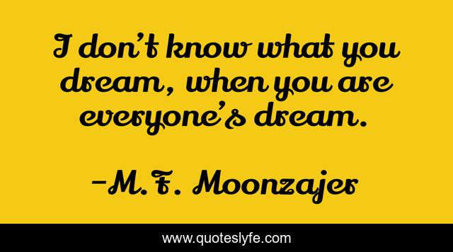 This page presents the quote "I don’t know what you dream, when you are everyone’s dream.". Author of this quote is M.F. Moonzajer. This quote is about everone, dream, beauty,.