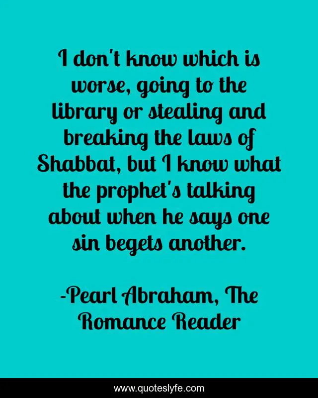 This page presents the quote "I don't know which is worse, going to the library or stealing and breaking the laws of Shabbat, but I know what the prophet's talking about when he says one sin begets another.". Author of this quote is Pearl Abraham, The Romance Reader. .