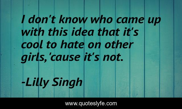 This page presents the quote "I don't know who came up with this idea that it's cool to hate on other girls, 'cause it's not.". Author of this quote is Lilly Singh. This quote is about hate, idea,.