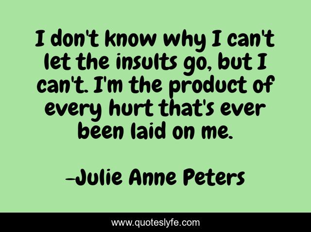 This page presents the quote "I don't know why I can't let the insults go, but I can't. I'm the product of every hurt that's ever been laid on me.". Author of this quote is Julie Anne Peters. This quote is about product, death, hurt, bullying, result, insults,.