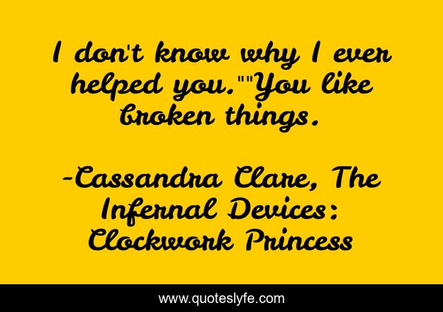 This page presents the quote "I don't know why I ever helped you.""You like broken things.". Author of this quote is Cassandra Clare, The Infernal Devices: Clockwork Princess. .