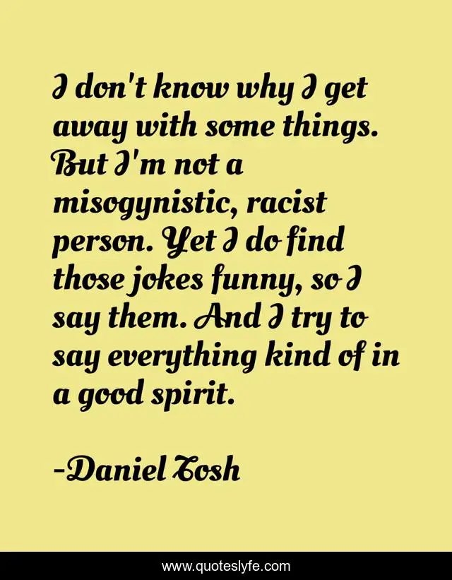This page presents the quote "I don't know why I get away with some things. But I'm not a misogynistic, racist person. Yet I do find those jokes funny, so I say them. And I try to say everything kind of in a good spirit.". Author of this quote is Daniel Tosh. This quote is about good, why,.