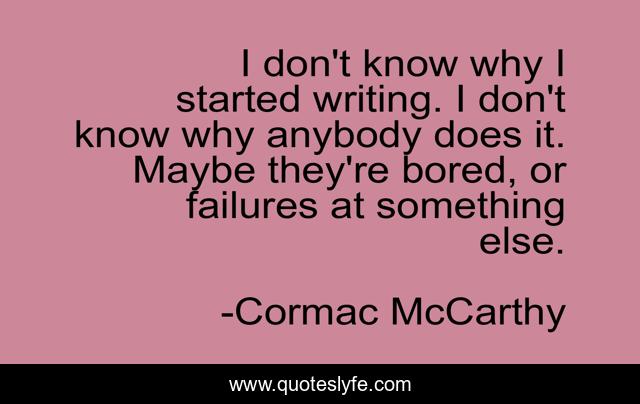 This page presents the quote "I don't know why I started writing. I don't know why anybody does it. Maybe they're bored, or failures at something else.". Author of this quote is Cormac McCarthy. .