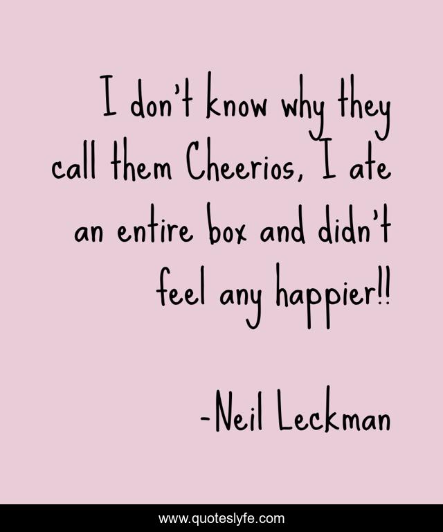 This page presents the quote "I don't know why they call them Cheerios, I ate an entire box and didn't feel any happier!!". Author of this quote is Neil Leckman. .