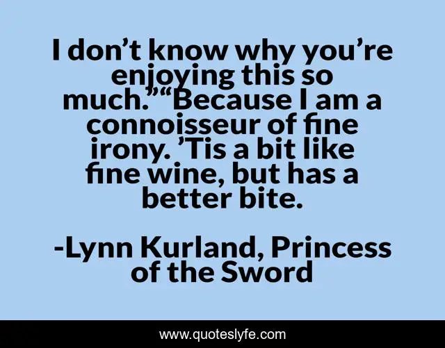 This page presents the quote "I don’t know why you’re enjoying this so much.”“Because I am a connoisseur of fine irony. ’Tis a bit like fine wine, but has a better bite.". Author of this quote is Lynn Kurland, Princess of the Sword. .