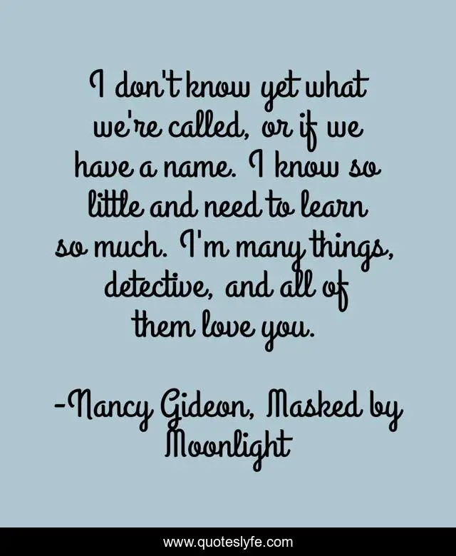 This page presents the quote "I don't know yet what we're called, or if we have a name. I know so little and need to learn so much. I'm many things, detective, and all of them love you.". Author of this quote is Nancy Gideon, Masked by Moonlight. .