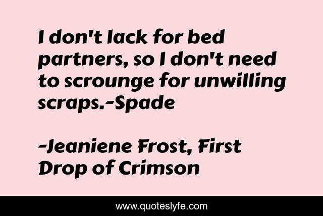 This page presents the quote "I don't lack for bed partners, so I don't need to scrounge for unwilling scraps.-Spade". Author of this quote is Jeaniene Frost, First Drop of Crimson. This quote is about night-huntress, classic, spade, hilarious,.