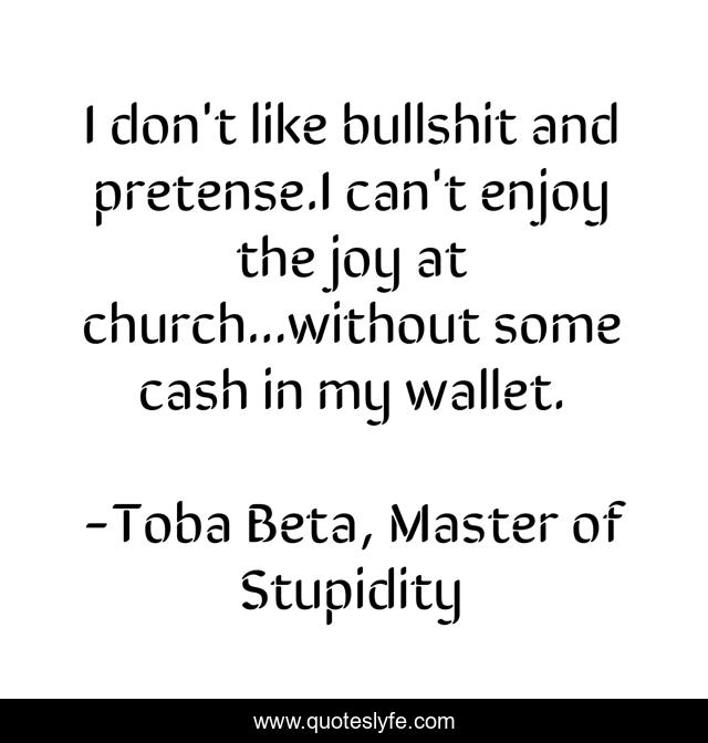 This page presents the quote "I don't like bullshit and pretense.I can't enjoy the joy at church...without some cash in my wallet.". Author of this quote is Toba Beta, Master of Stupidity. This quote is about money, pretense, church,.