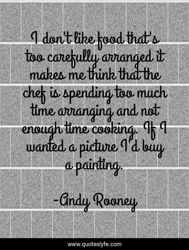 This page presents the quote "I don't like food that's too carefully arranged it makes me think that the chef is spending too much time arranging and not enough time cooking. If I wanted a picture I'd buy a painting.". Author of this quote is Andy Rooney. This quote is about chef, cooking, time,.