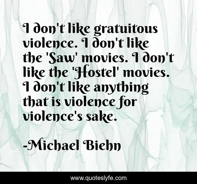 This page presents the quote "I don't like gratuitous violence. I don't like the 'Saw' movies. I don't like the 'Hostel' movies. I don't like anything that is violence for violence's sake.". Author of this quote is Michael Biehn. This quote is about violence, like, anything,.