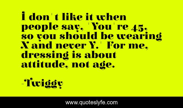 This page presents the quote "I don't like it when people say, 'You're 45, so you should be wearing X and never Y.' For me, dressing is about attitude, not age.". Author of this quote is Twiggy. This quote is about me, age, people,.