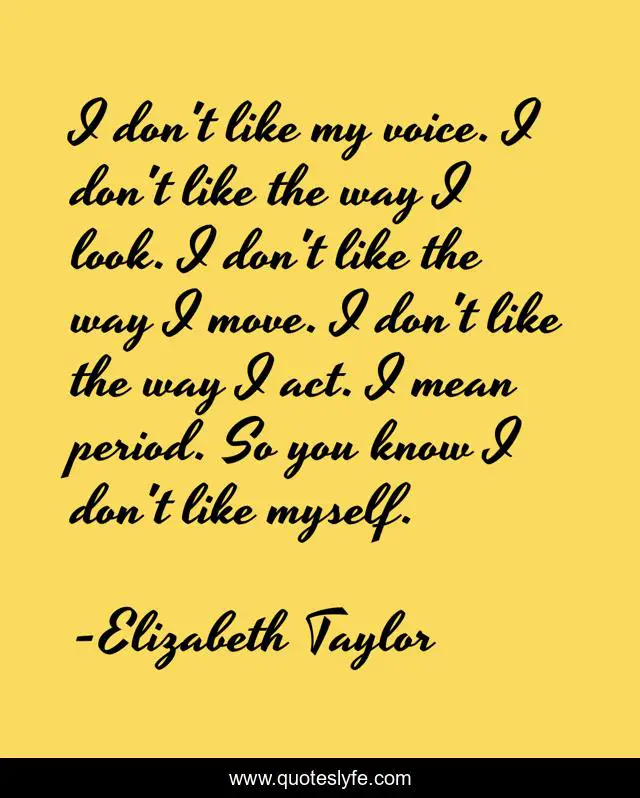 This page presents the quote "I don't like my voice. I don't like the way I look. I don't like the way I move. I don't like the way I act. I mean period. So you know I don't like myself.". Author of this quote is Elizabeth Taylor. .