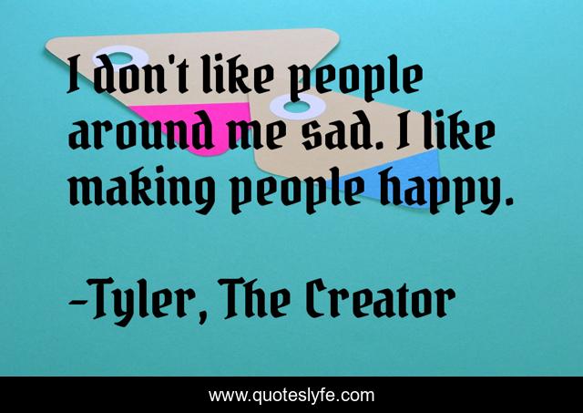 This page presents the quote "I don't like people around me sad. I like making people happy.". Author of this quote is Tyler, The Creator. This quote is about me, happy, people,.