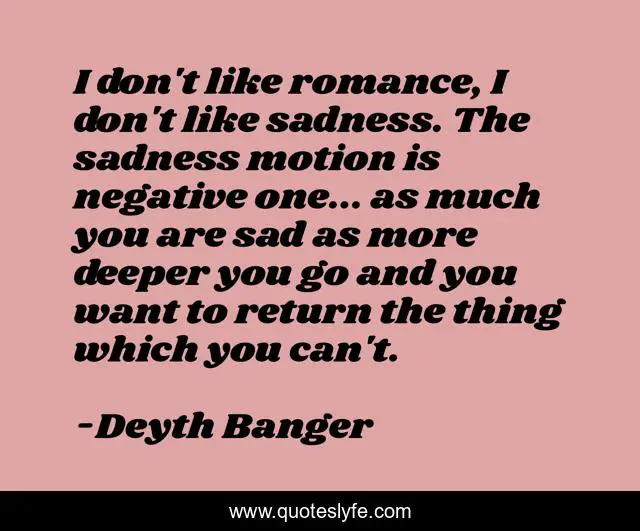 This page presents the quote "I don't like romance, I don't like sadness. The sadness motion is negative one... as much you are sad as more deeper you go and you want to return the thing which you can't.". Author of this quote is Deyth Banger. This quote is about romance, sadness, can-t, sad,.