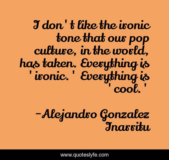 This page presents the quote "I don't like the ironic tone that our pop culture, in the world, has taken. Everything is 'ironic.' Everything is 'cool.'". Author of this quote is Alejandro Gonzalez Inarritu. This quote is about culture, tone, world,.