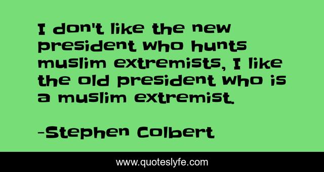 This page presents the quote "I don't like the new president who hunts muslim extremists, I like the old president who is a muslim extremist.". Author of this quote is Stephen Colbert. .