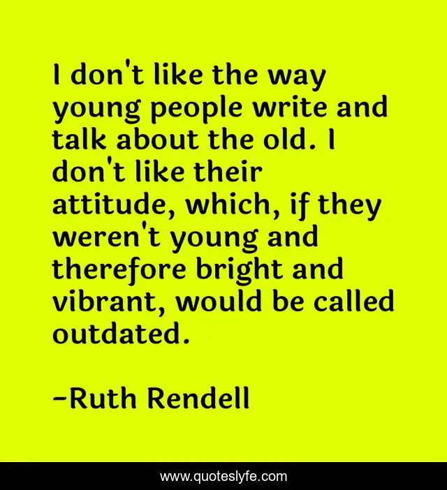 This page presents the quote "I don't like the way young people write and talk about the old. I don't like their attitude, which, if they weren't young and therefore bright and vibrant, would be called outdated.". Author of this quote is Ruth Rendell. This quote is about bright, young, people,.