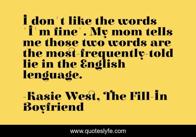 This page presents the quote "I don't like the words 'I'm fine'. My mom tells me those two words are the most-frequently-told lie in the English lenguage.". Author of this quote is Kasie West, The Fill-In Boyfriend. This quote is about lie, english-language, fine,.