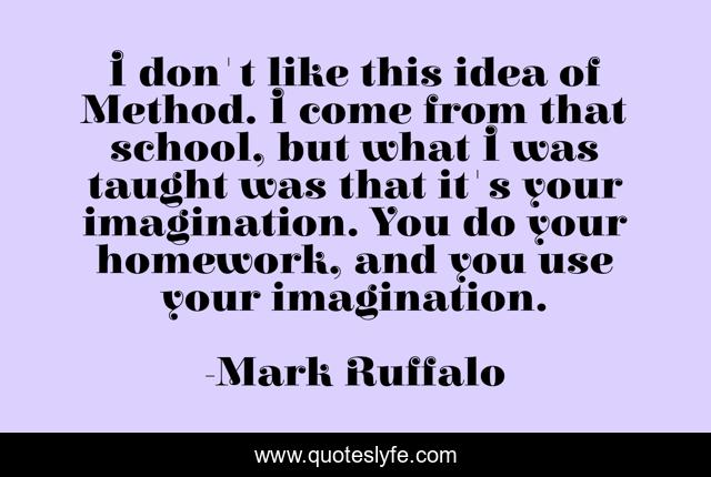 This page presents the quote "I don't like this idea of Method. I come from that school, but what I was taught was that it's your imagination. You do your homework, and you use your imagination.". Author of this quote is Mark Ruffalo. This quote is about school, homework,.