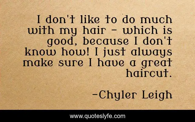 This page presents the quote "I don't like to do much with my hair - which is good, because I don't know how! I just always make sure I have a great haircut.". Author of this quote is Chyler Leigh. This quote is about hair, good, haircut,.