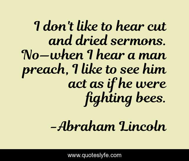 This page presents the quote "I don't like to hear cut and dried sermons. No—when I hear a man preach, I like to see him act as if he were fighting bees.". Author of this quote is Abraham Lincoln. This quote is about god, preacher, religion, bees, preaching, church, sermons, sermon, chapel,.