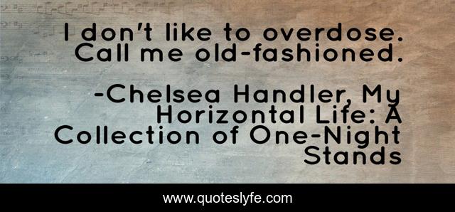 This page presents the quote "I don't like to overdose. Call me old-fashioned.". Author of this quote is Chelsea Handler, My Horizontal Life: A Collection of One-Night Stands. This quote is about drug-use, drugs, drinking, humor, alcohol,.
