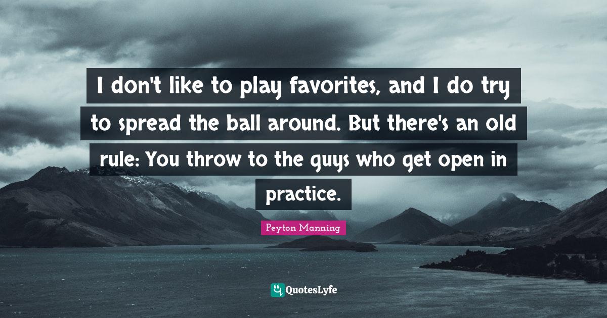 This page presents the quote "I don't like to play favorites, and I do try to spread the ball around. But there's an old rule: You throw to the guys who get open in practice.". Author of this quote is Peyton Manning. This quote is about play, spread, practice, nfl,.